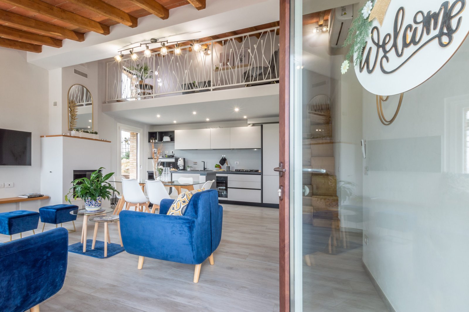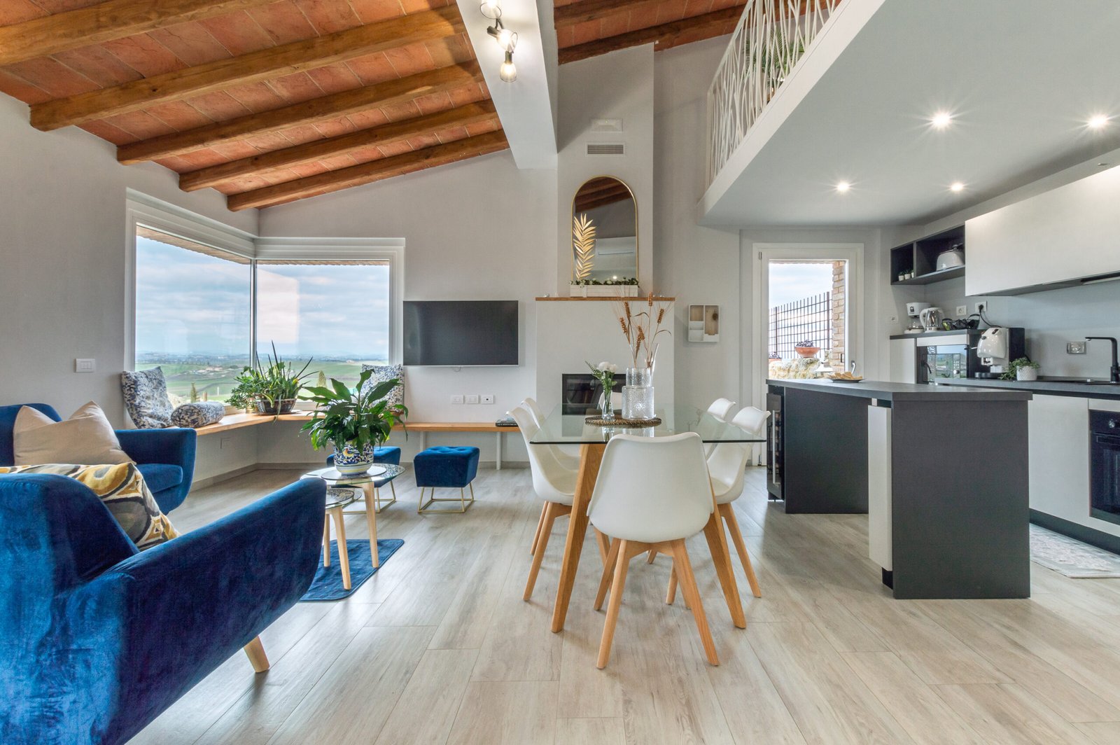 Villa Daisy is all on one floor and features a large terrace exclusively for guests, as well as other green areas. The apartment has an open space layout with a fully equipped kitchen and a living room with large windows that offer a stunning view of Siena. There is also a loft area, perfect for relaxing, enjoying a good glass of wine, or letting the children play.